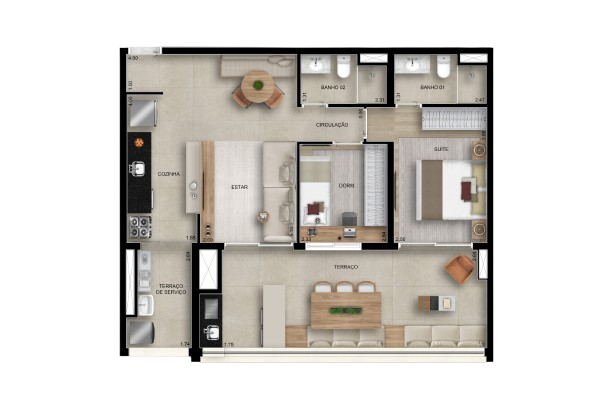 82 m²: 2 dormitórios (1 suíte), varanda gourmet, 1 vaga de garagem.