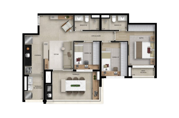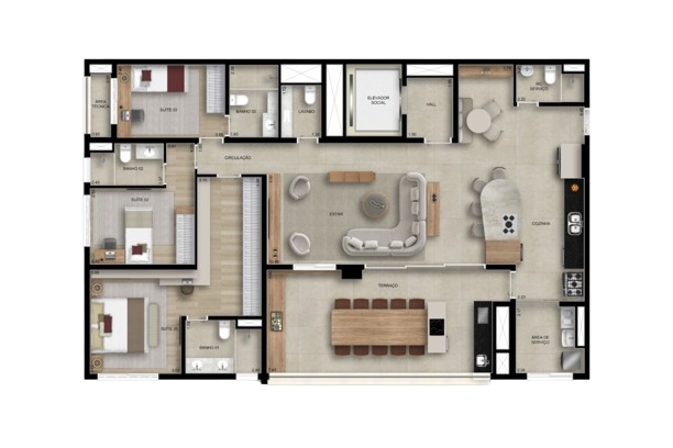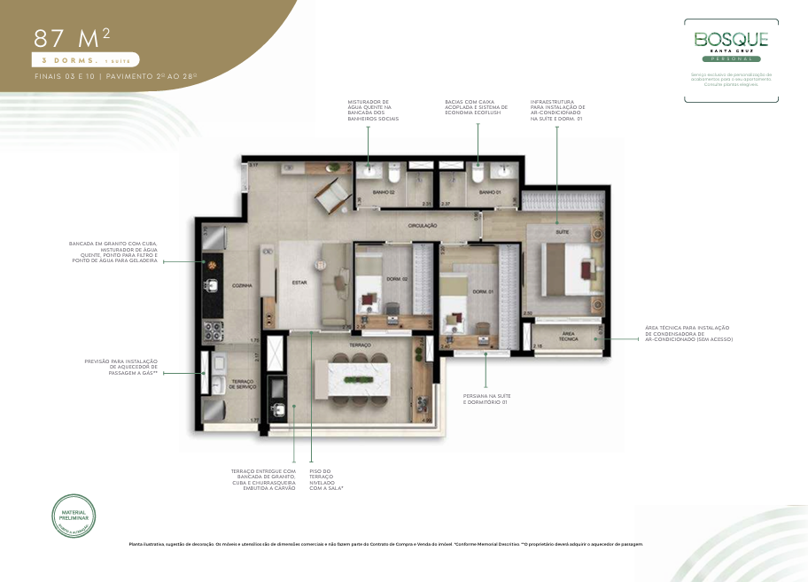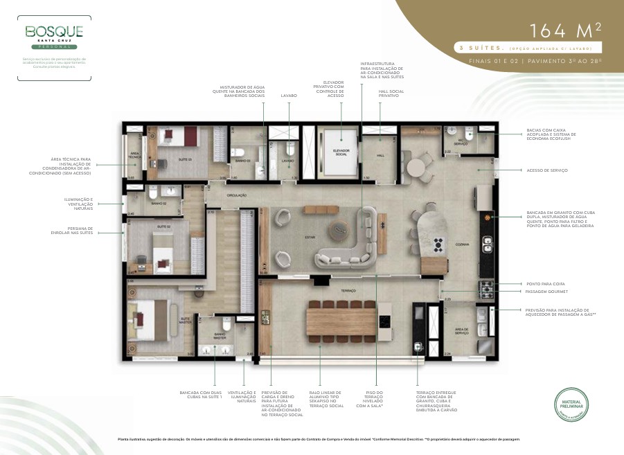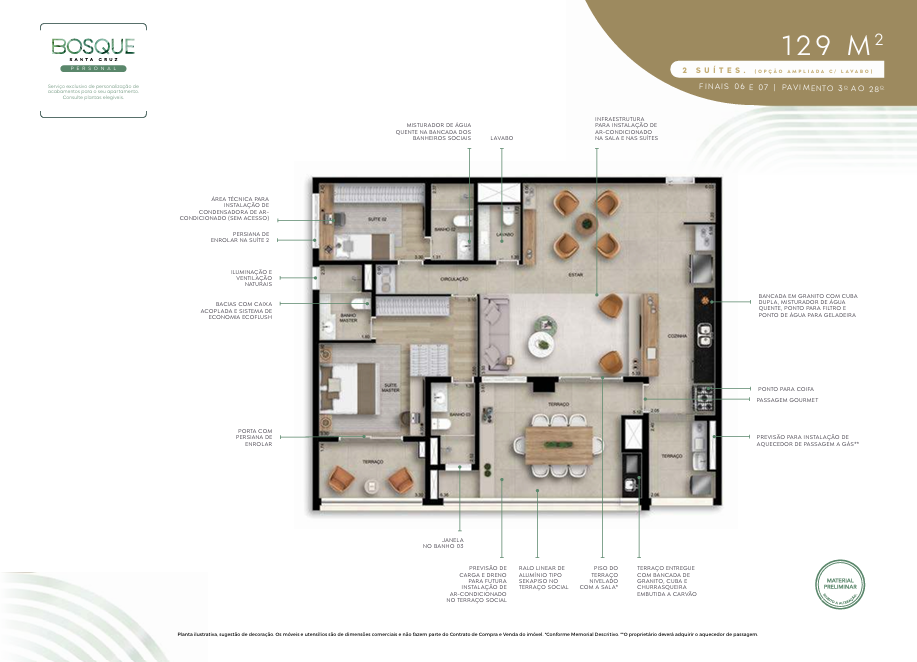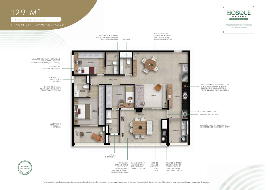 131 m²: 3 suítes, varanda gourmet, lavabo, depósito, 2 vagas de garagem.