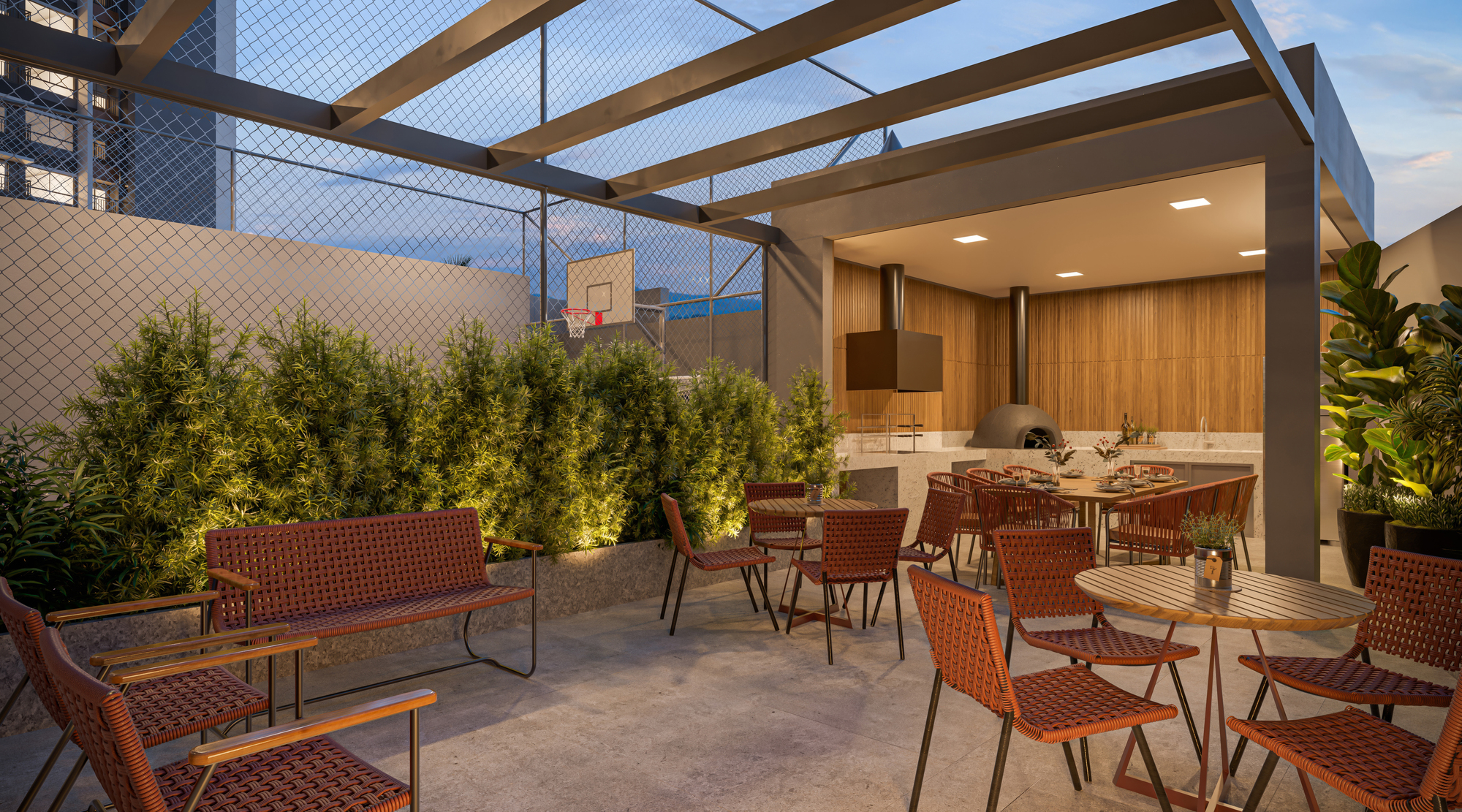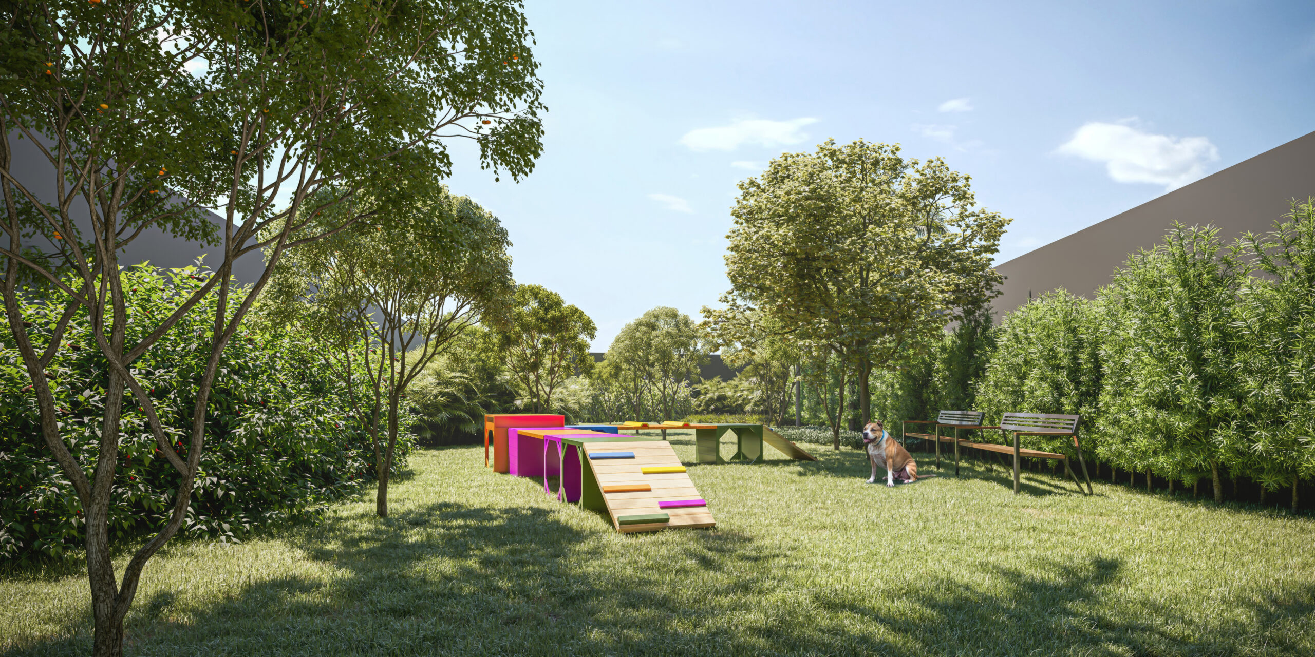 O Bosque Diálogo conta com piscina adulto e infantil, salão de festas, espaço gourmet, academia, brinquedoteca, playground, coworking, espaço pet e um bosque privativo de 400m².
