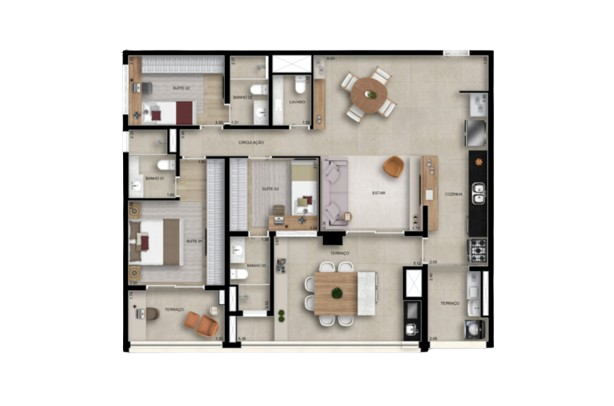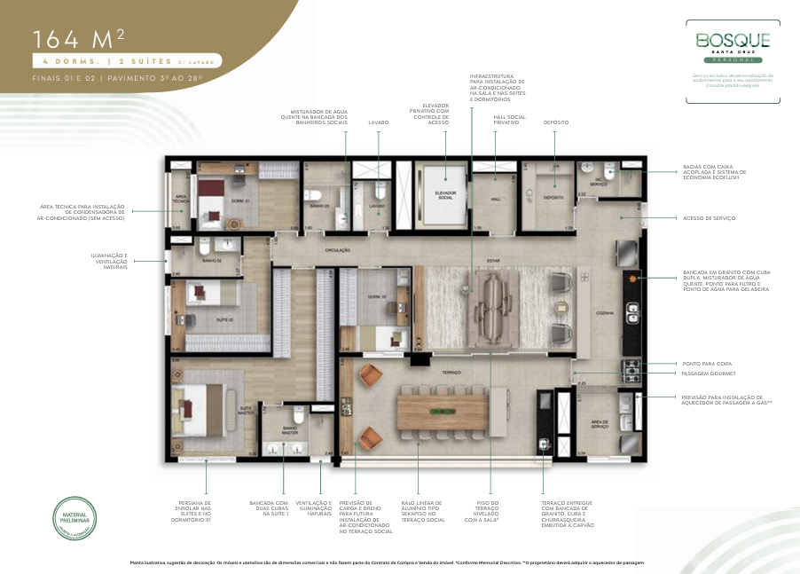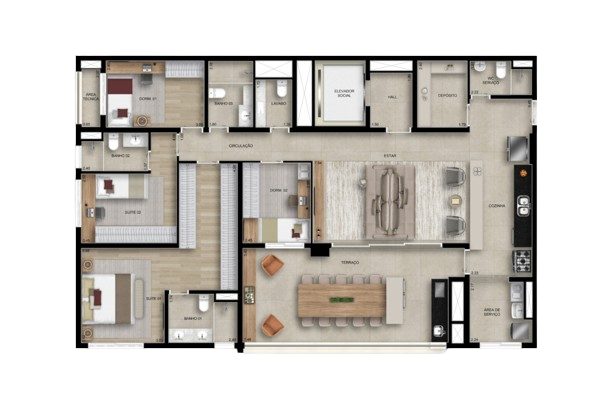 169 m²: 4 dormitórios (2 suítes), varanda gourmet, lavabo, depósito, 2 vagas de garagem.